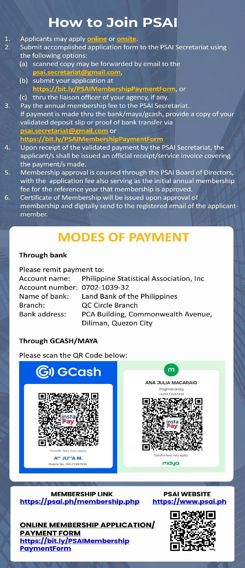 Submit the accomplished application form (preferably in PDF format, bearing your signature and photo) through this online portal: PSAI Membership Payment Form, along with proof of payment for the membership fee. (Suggested filename: "PSAI_membership_form_individual - Complete Name.pdf")